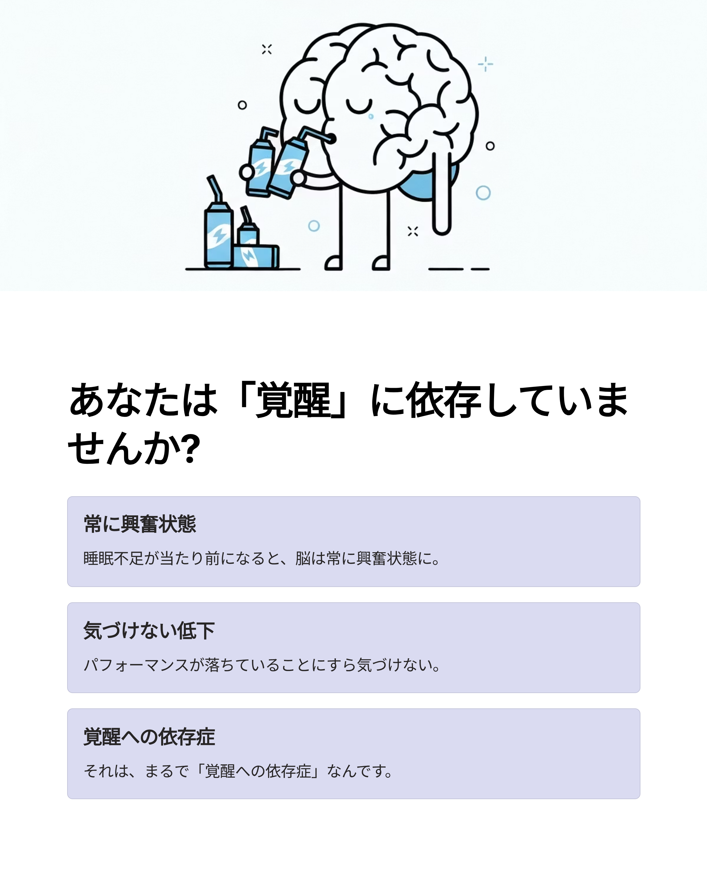 - 多くの働く人は、自覚のない「覚醒依存症」に陥っている。