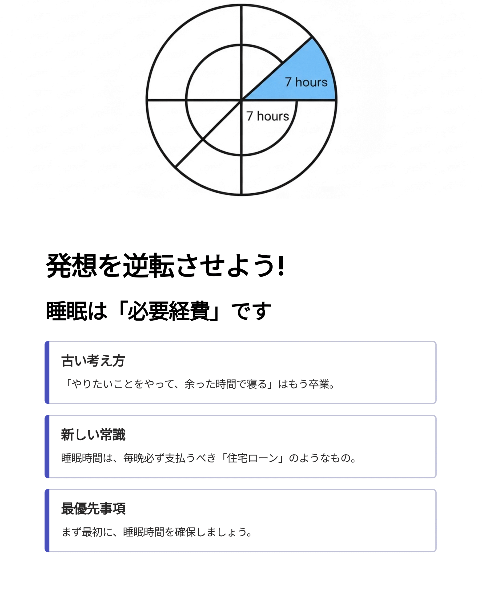 - 睡眠は余った時間でするものではなく、最優先で確保すべき「必要経費」。