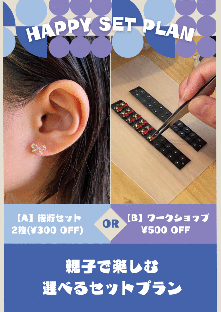今回、大人が耳つぼジュエリーを体験してくださると、お子様向けの特典が選べる、とってもお得なキャンペーンを実施します!