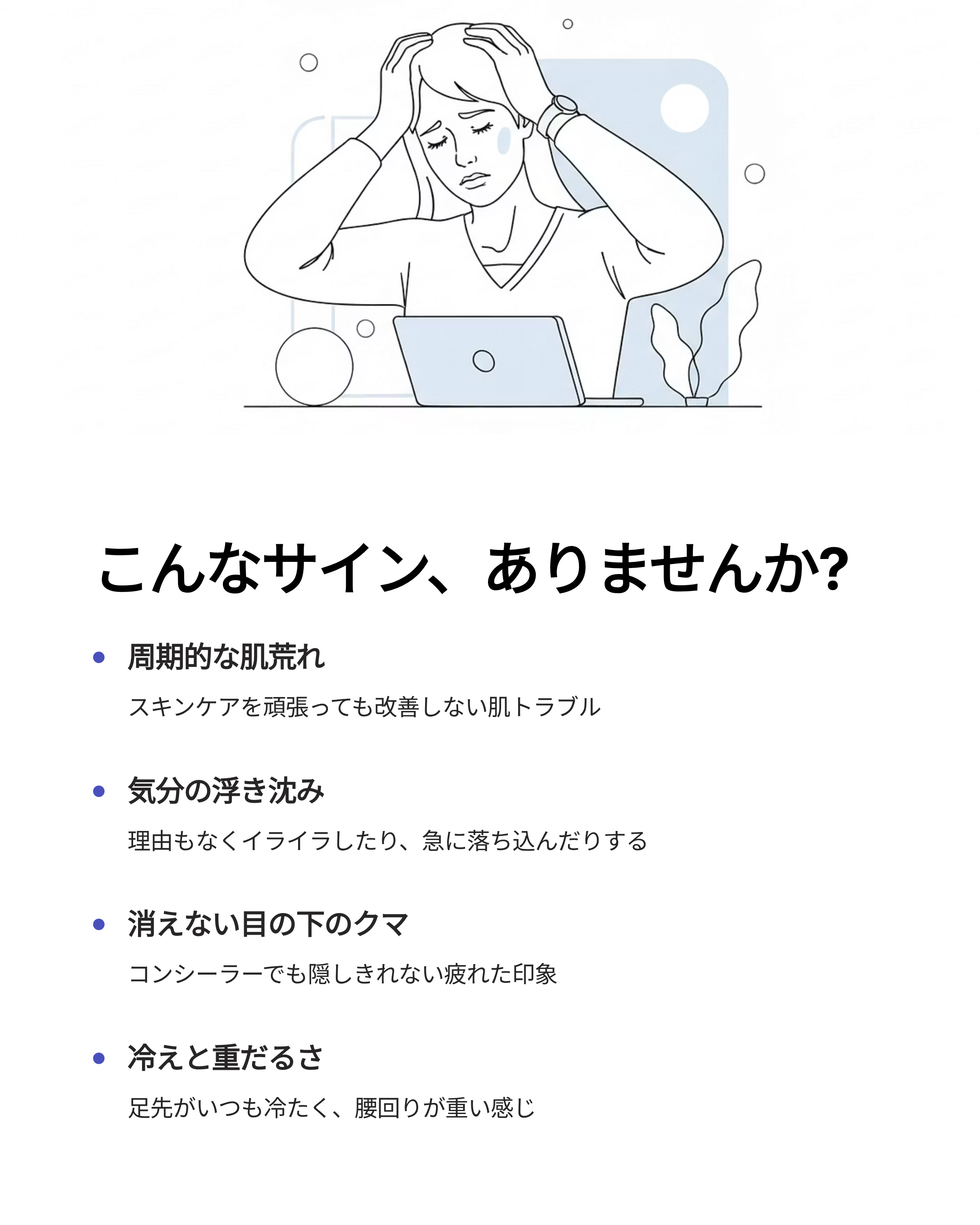 特に、女性ホルモンの分泌が緩やかに変化し始める30代後半からは、この影響が肌荒れや気分の浮き沈み、冷えや倦怠感といった形で、より顕著に現れやすくなります。